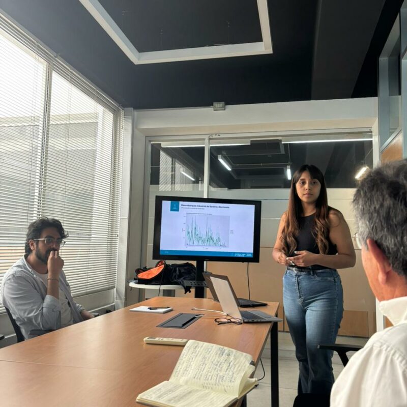 Sofía Valderrama Villalobos presentó avances de su trabajo “Patrones temporales que influyen en el desembarque de Dosidicus gigas y su relación con variables ambientales”, desarrollado en colaboración con la investigadora IFOP MSc. Karen Belmar Salinas, responsable del taller.